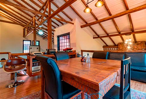 Outro diferencial da pousada é o espaço de coworking, com diversas estações de trabalho, mesas e sofás distribuídos em um amplo espaço no mezanino.